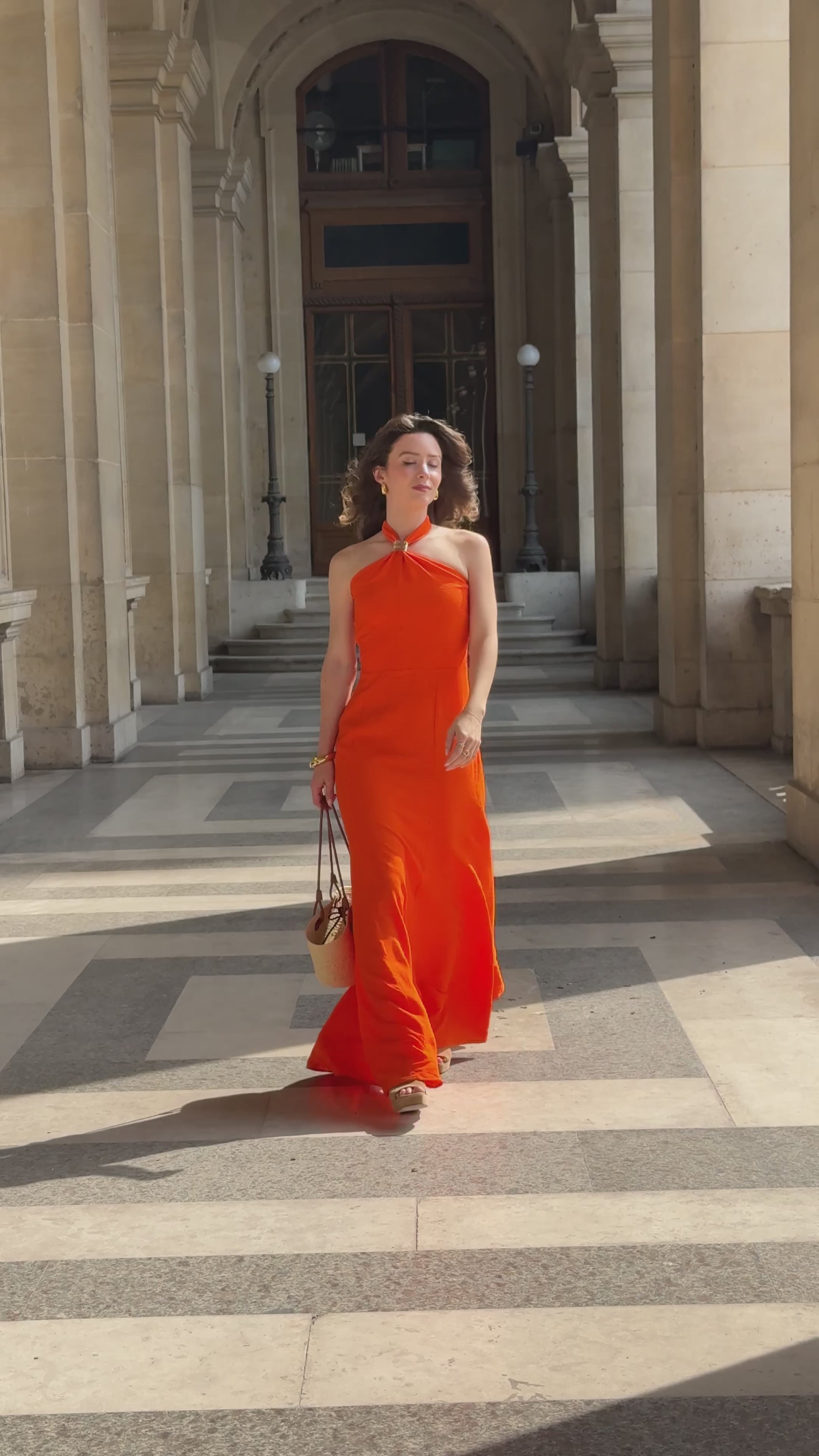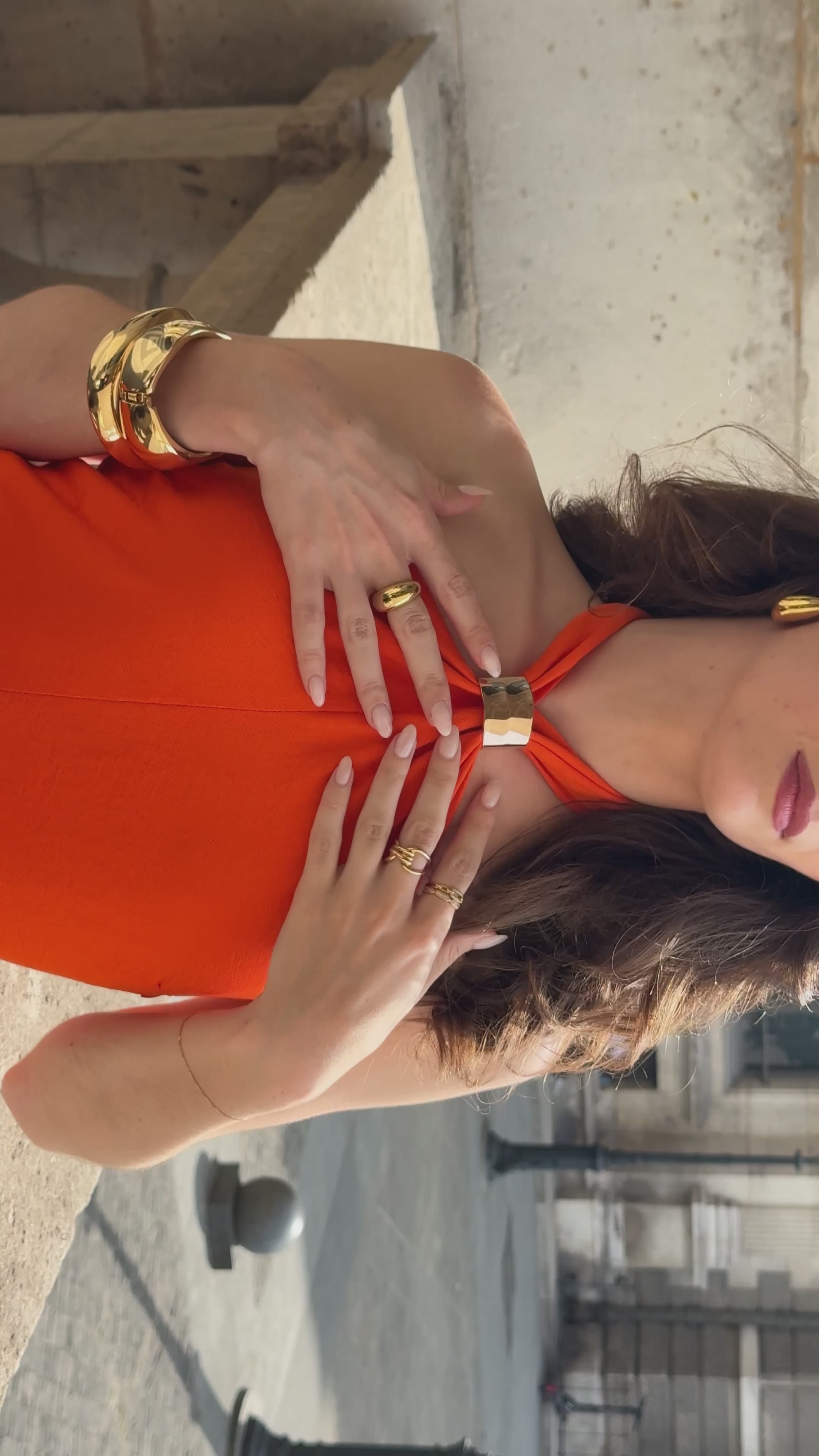 La robe Daniela s’attache au cou, avec un noeud à faire soi-même. Un bijou-bague amovible doré, accompagne le haut de la robe.