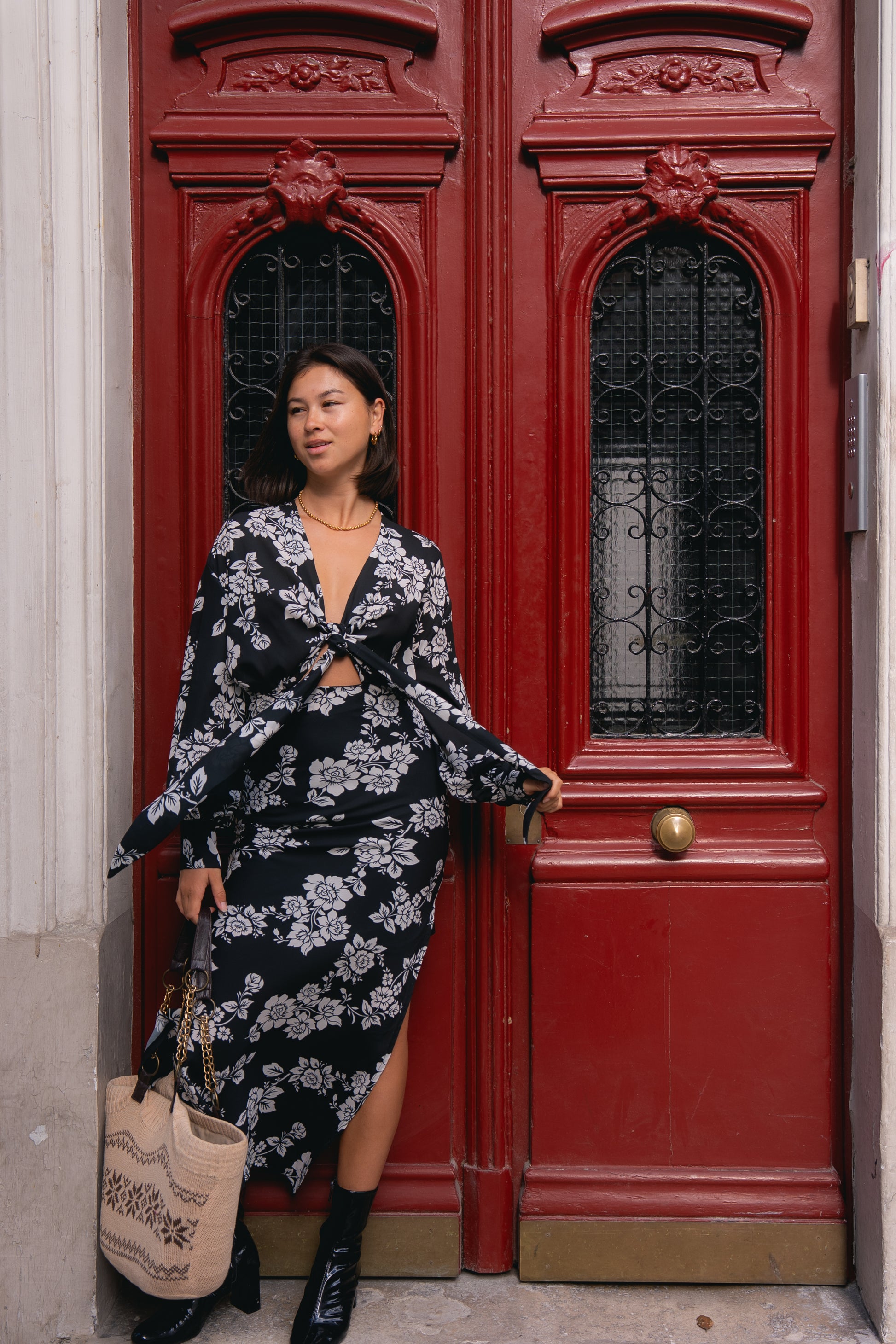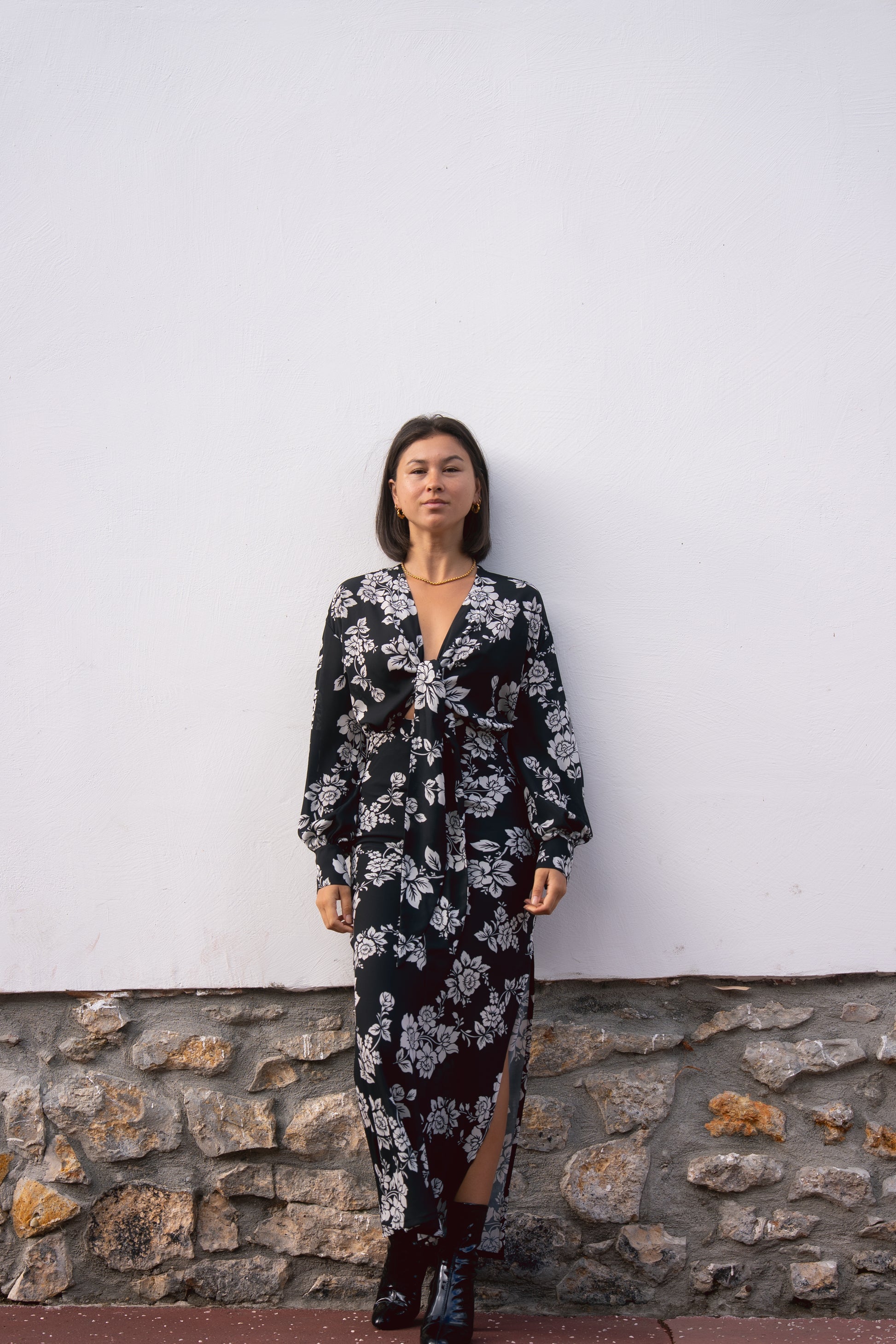 Élégante et féminine, cette robe longue se distingue par son nœud à l’avant, sa coupe fluide et sa fente subtile sur la jambe. L’ouverture se fait par un zip côté invisible. Un imprimé floral intemporel qui sublime la silhouette, de jour comme de nuit.