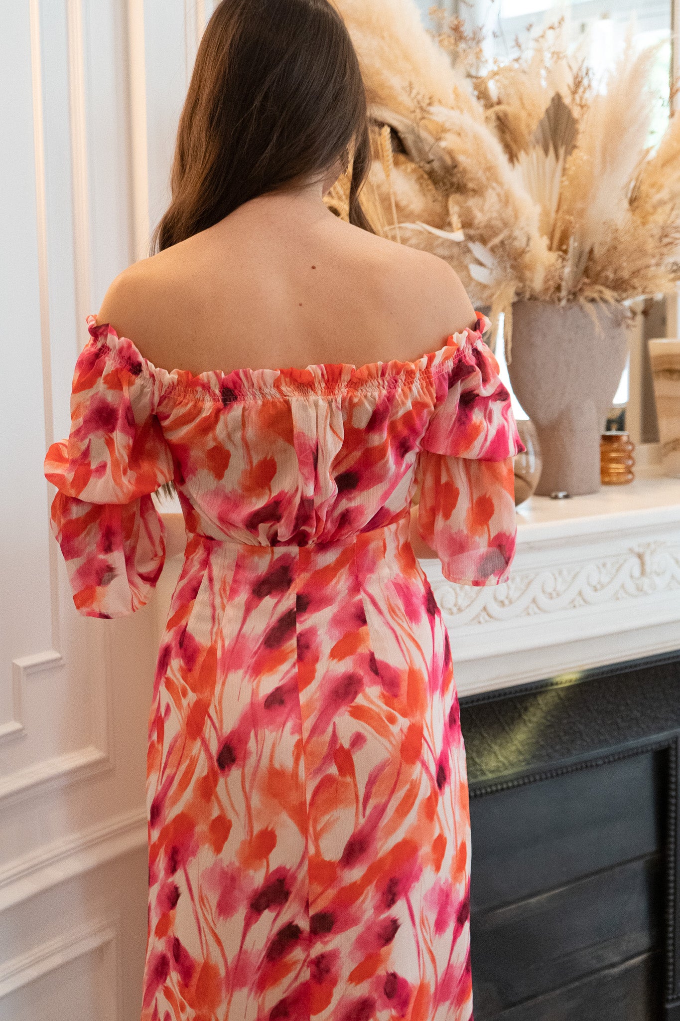 Cette robe est dénudée aux épaules, accompagnée d’un Smock très confortable. Et d’un lien dans le même tissu que la robe au dessus de la poitrine. Le haut blouse, contrairement à la jupe qui épouse le bas du corps, avec sa fente devant au centre. Le bas de la robe est toute doublée par un tissu uni rose pâle. Cette robe s’enfile par un zip invisible côté.