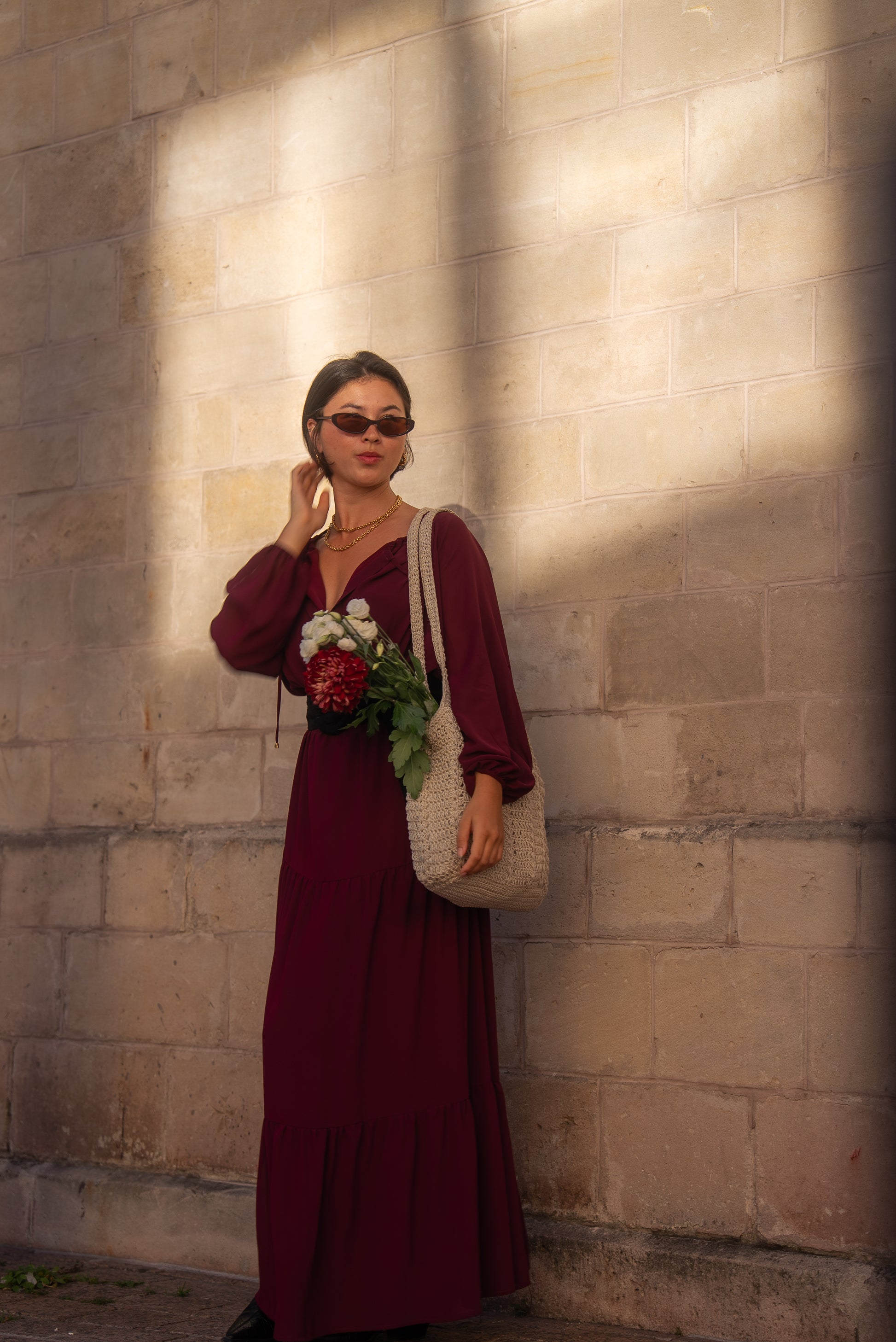 Cette  robe longue, couleur lie de vin,  est la pièce idéale pour allier confort et sophistication. Sa coupe fluide et aérienne épouse les mouvements avec légèreté, tandis que son décolleté subtilement plongeant met en valeur le port de tête.
