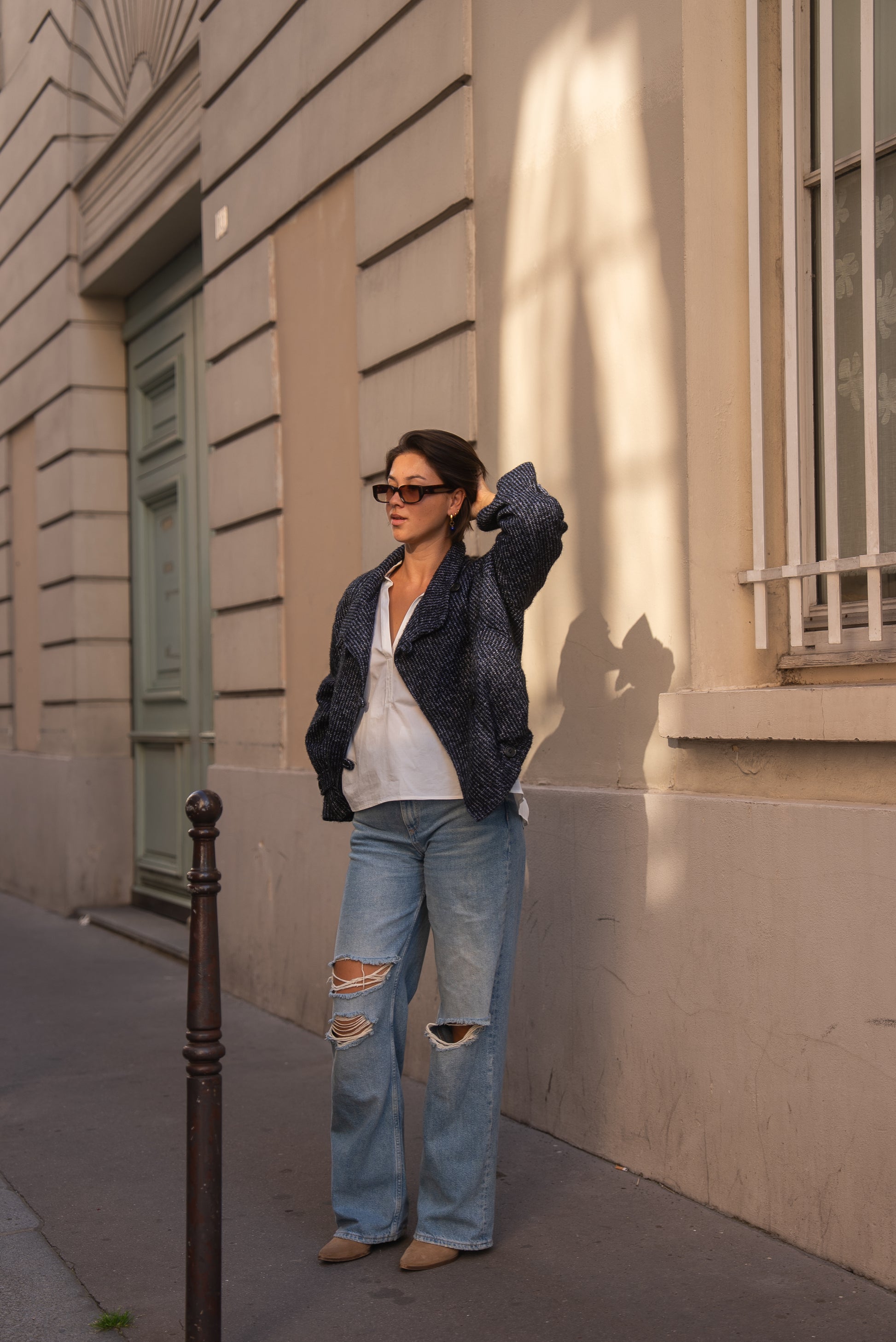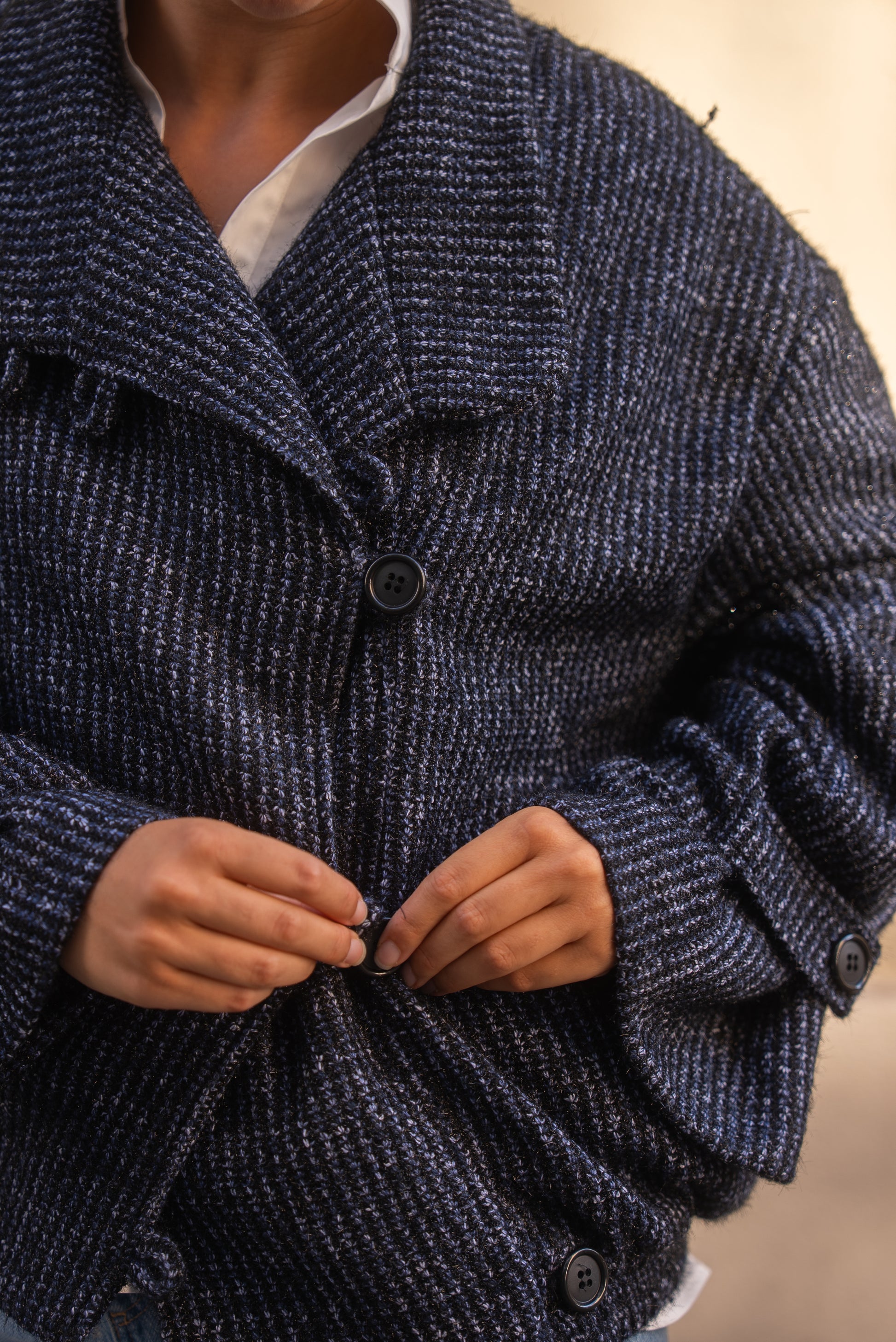 Cette veste oversize en maille texturée est la pièce parfaite pour affronter les journées fraîches tout en restant stylée. Avec son col large et ses détails boutonnés, elle apporte une allure sophistiquée et effortless à toutes vos tenues.