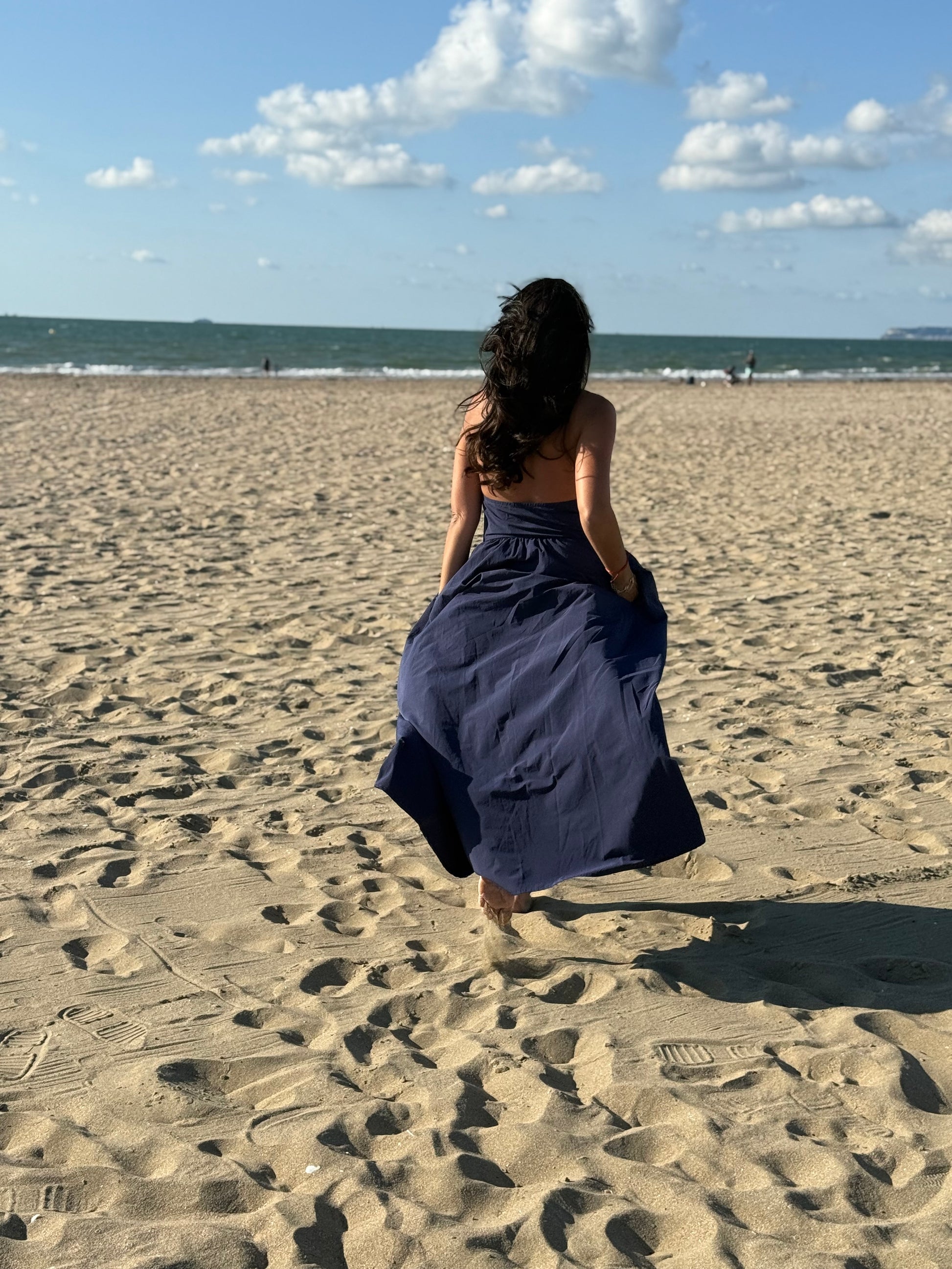 - Robe longue bleu nuit, toute boutonnée pour l’ouverture.