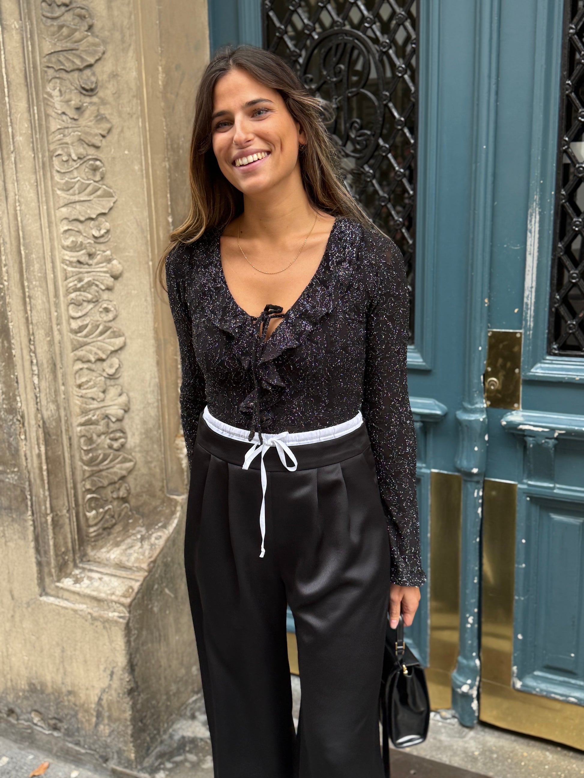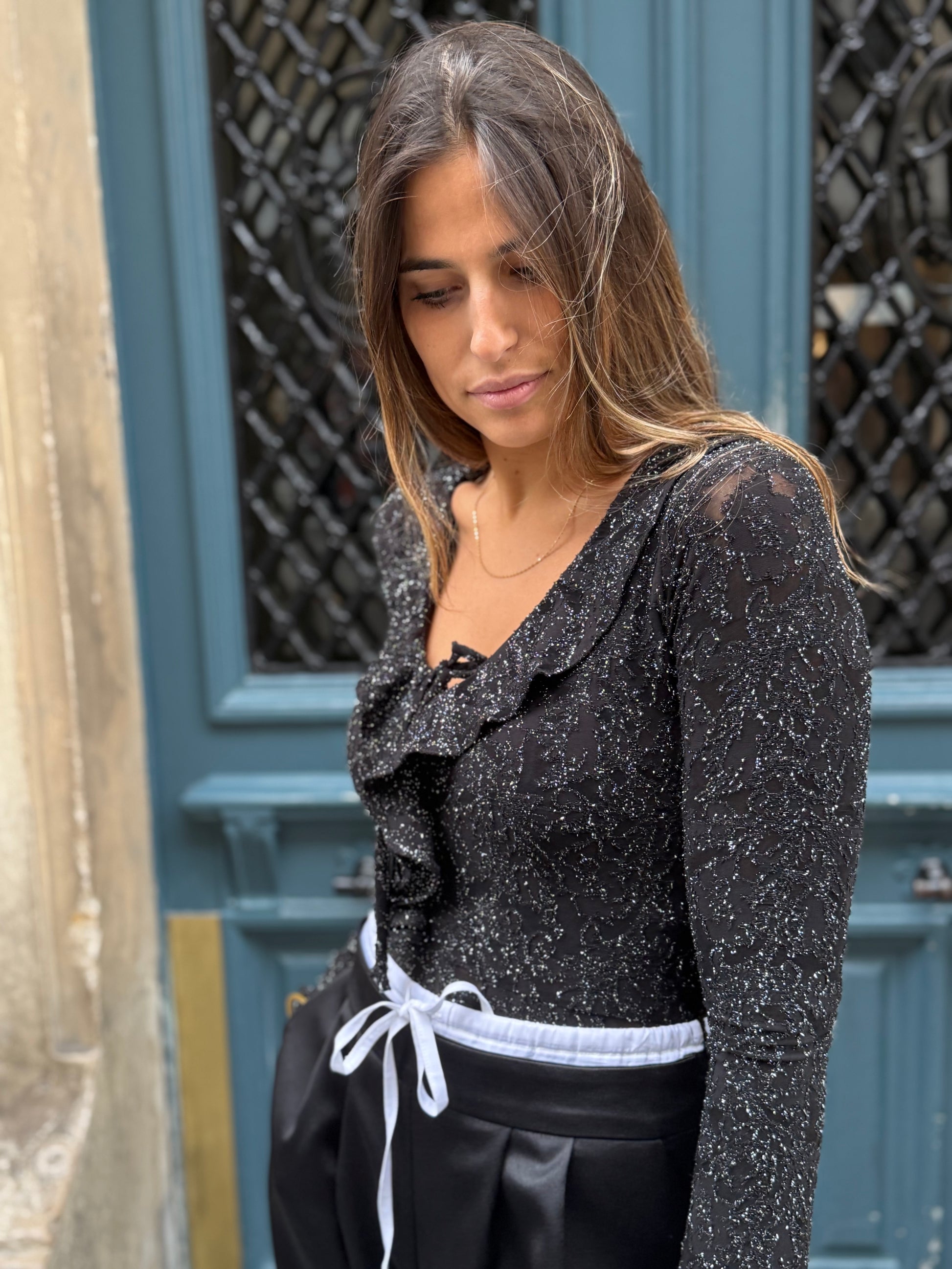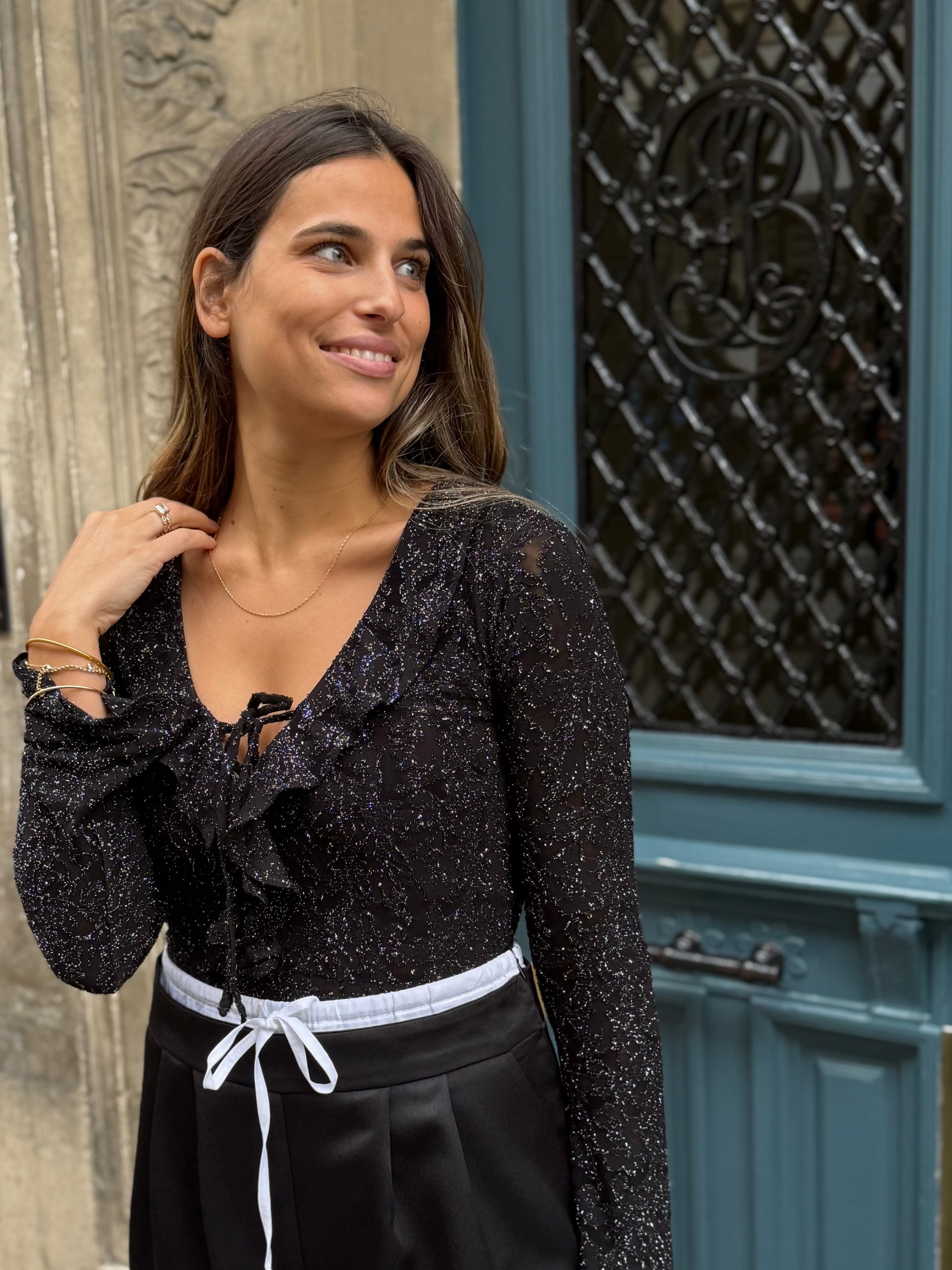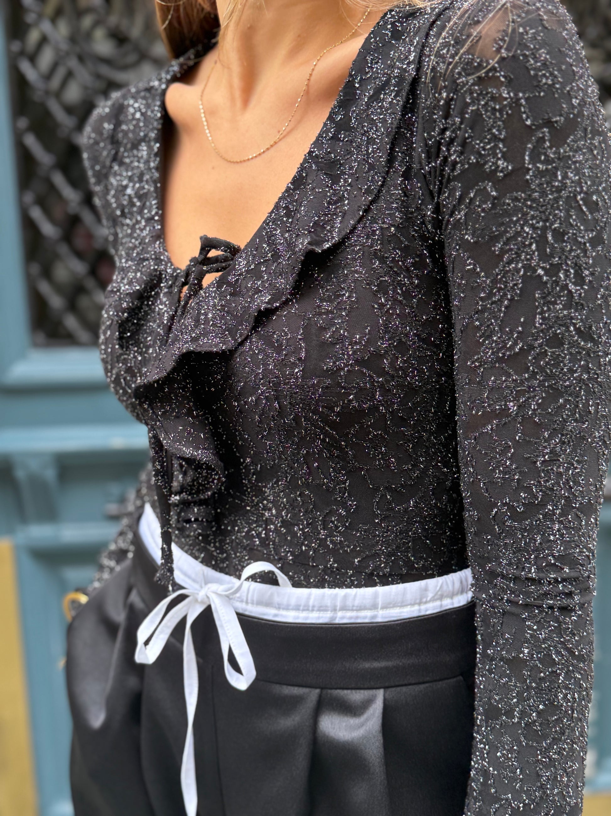 Le body Judith en maille brillante noir est la pièce parfaite pour illuminer vos soirées. Conçu dans une maille fine et légèrement irisée, iSon décolleté en V délicatement orné de volants et d’un lien à nouer apporte une touche féminine et raffinée. Attache body réglable sur le bas.